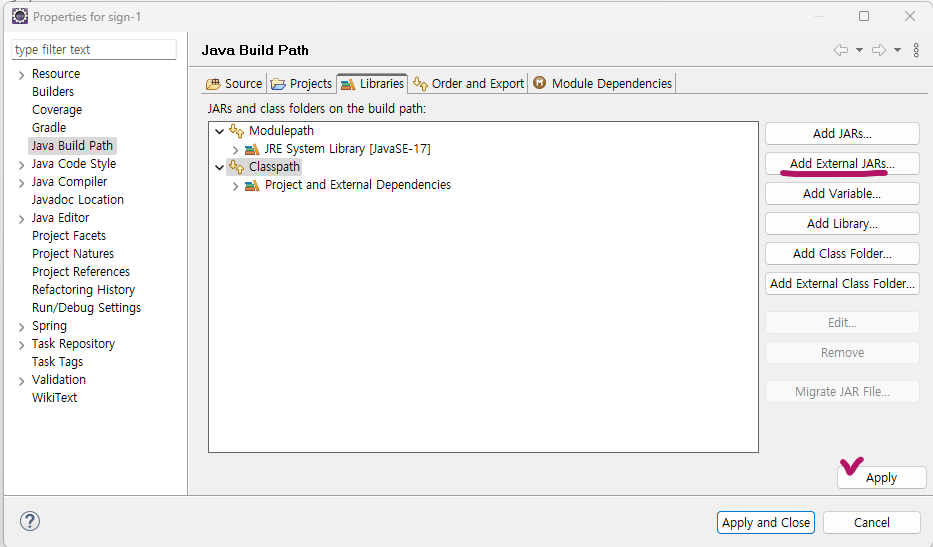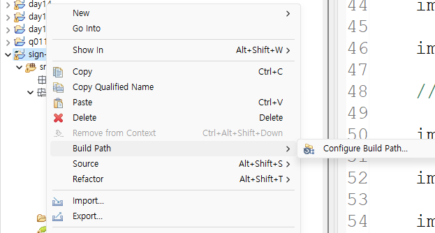 다운받은 라이브러리 jar혹은 zip파일을 경로추가해주는 방법인데, 마찬가지로 프로젝트에서 오른쪽 마우스 클릭으로 들어갈 수 있고,