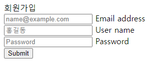 (이 때 이메일 값은 validation 체크를 추가하여 적절한 이메일 형식이 아니면 가입폼 제출이 불가능하도록 하였다.)