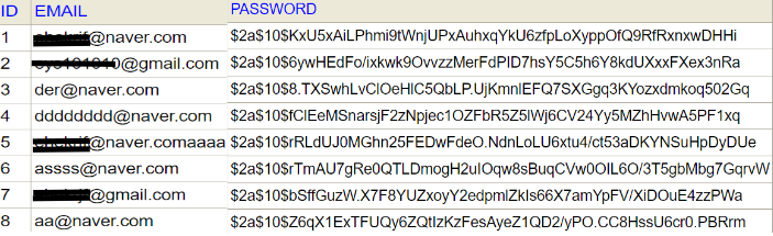 3) 패스워드는 암호화되어 저장되도록 진행(위의 저장값은 입력시 모두 임의의 5~6자리로 입력하였다.)