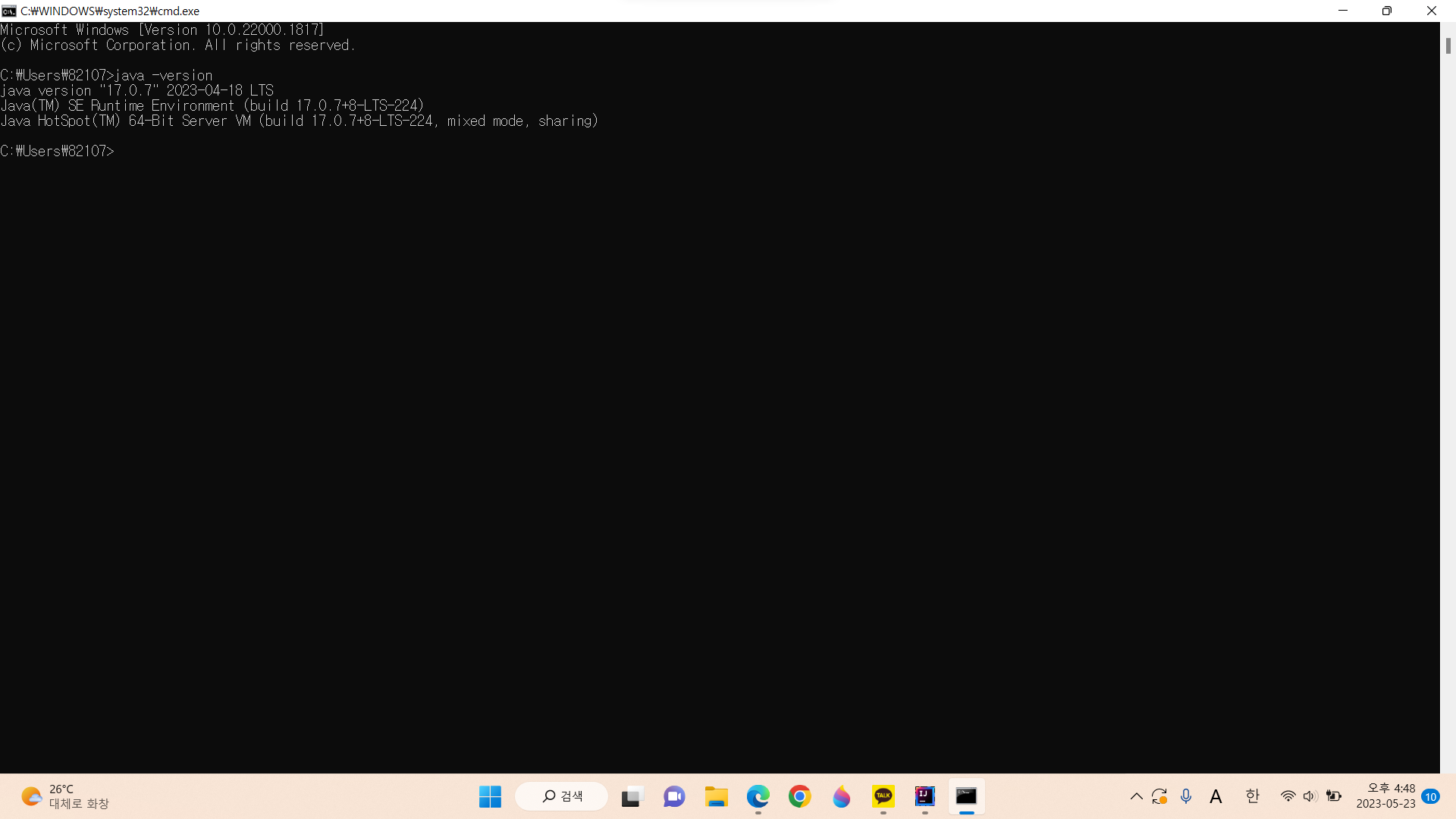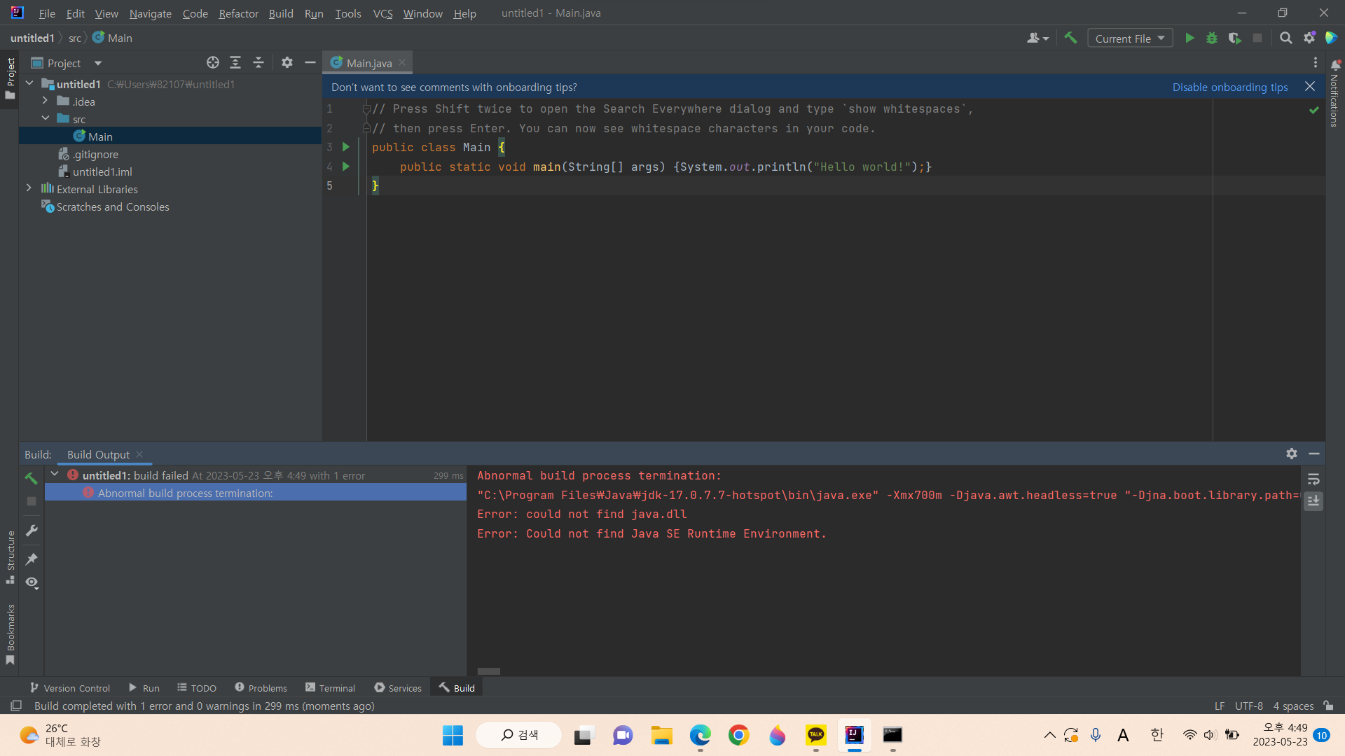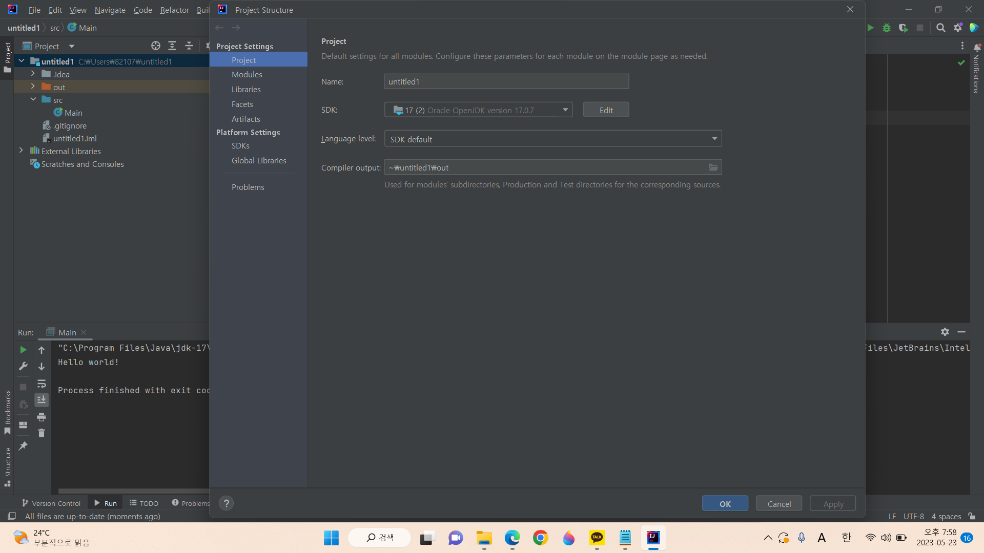 어제 JDK 설치를 시도하였을 때 CMD 창에서 설치 완료가 확인되지 않아 우선은 강의 먼저 듣고 오늘 개인적으로 JDK 설치 방법을 서치해 시도하여 CMD 창에서 설치 완료를 확인하였다. 그런데 IntelliJ에서 자바를 찾을 수 없다는 에러가 발생했다. 구글링해서 방법 찾다가 막혀서 튜더님께 질문을 드려 문제를 해결하였다.