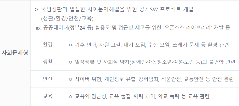SW 개발 공모전은 참여 주제로 유형을 나눴다. 기업과제, 사회문제, 지속발전과제였는데 우리는 이 중, 사회문제 유형을 선택했다.