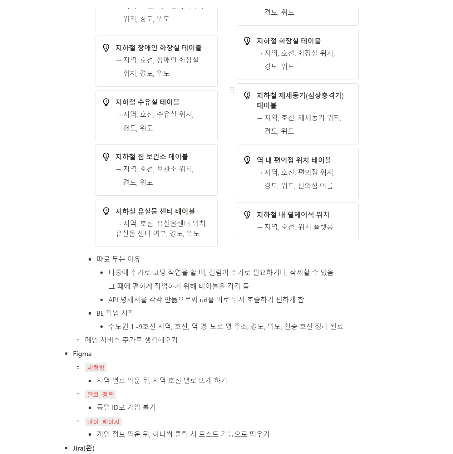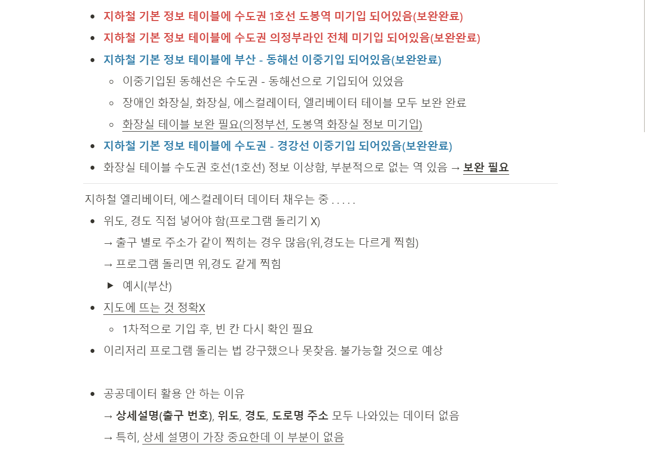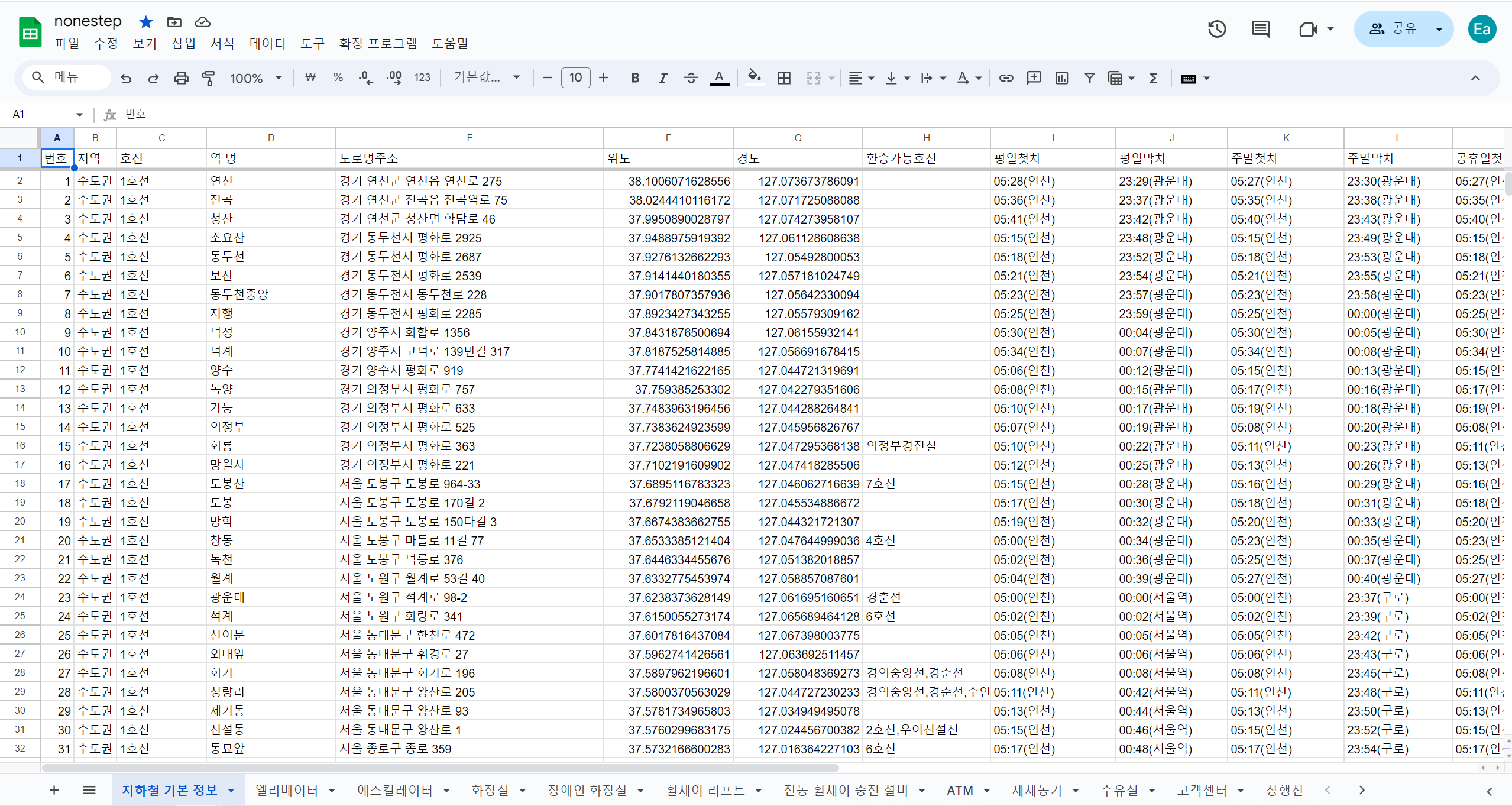 지하철 기본 정보, 엘리베이터, 에스컬레이터, 화장실, 장애인 화장실, 휠체어 리프트, 전동 휠체어 충전 설비, ATM, 제세동기, 수유실, 고객센터를 포함한 데이터 전처리 과정을 완료했으며, 추가적으로 지하철 기본 정보에 들어갔던 시간표 테이블을 따로 빼 상, 하행선 시간표를 보다 정확하게 작업 중에 있다.