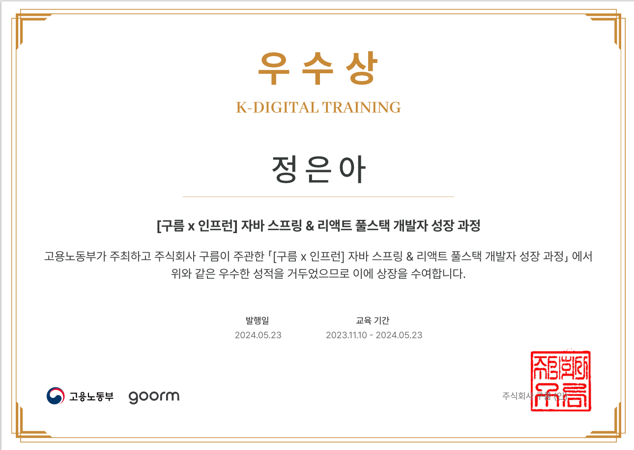 - 구름톤 풀스택 4회차 우수 수료생으로 선발되었다. 딱 1명 뽑는 귀한 상인데.. 감사하게도 내가 받게 되었다. 수료식 날, 시상식 중 내 이름이 나와서..