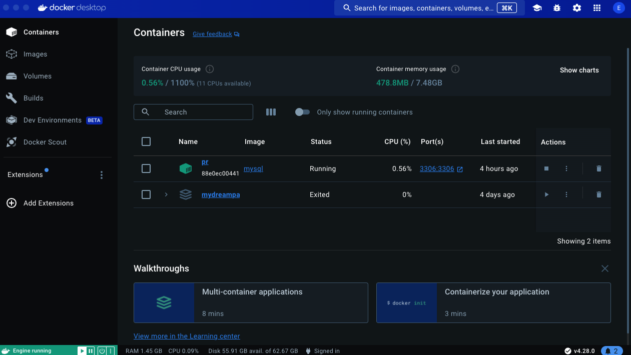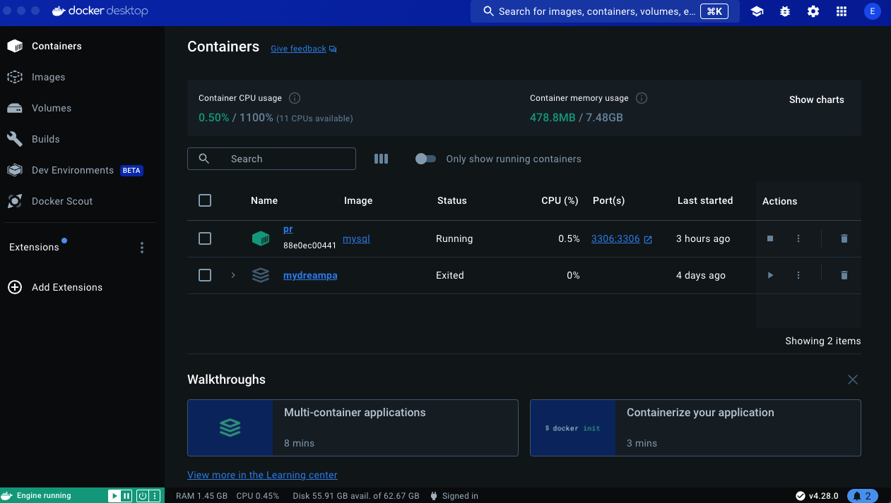 이렇게 초록색으로 표시된 컨테이너의 Status가 Running으로 표시된 것을 볼 수 있다.