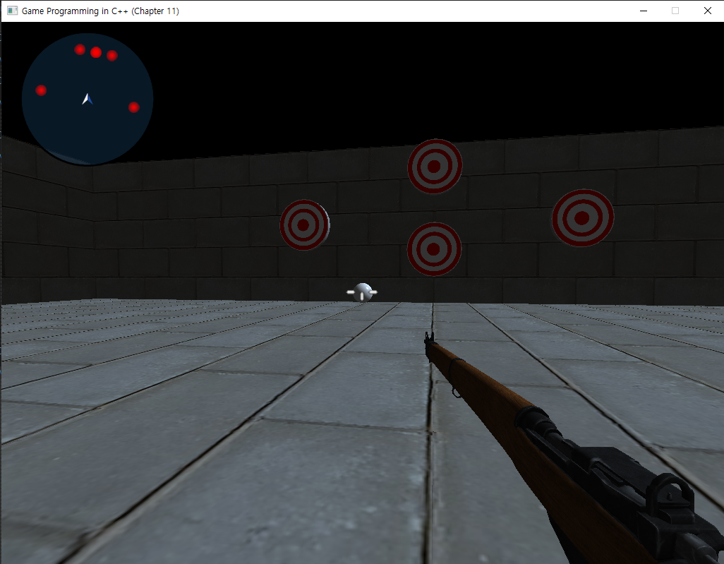 mBlips 벡터는 레이더 중심에서 상대적인 신호들의 2D 오프셋을 기록한다. 레이더를 갱신할때 mBlips 벡터도 갱신된다. 그리고 레이더를 그릴 때는 배경을 먼저 그린 뒤 신호들의 2D 오프셋을 사용해서 신호 텍스처를 그린다. mRadarRange 변수는 세계 공간에서 레이더가 인식할 범위를 나타내고 mRadarRadius 변수는 그려질 2D 레이더의 지름이다. 게임에 50 단위의 범위를 가진 레이더가 있다고 가정하고 플레이어 바로 앞 25 단위에 물체가 있다고 하면 오브젝트의 위치는 3D 상에 있지만 플레이어의 위치와 물체 위치를 모두 화면 레이더 상의 2D 좌표로 변환해야한다. z축이 상향 벡터인 세계 에서는 xy 평면 상으로 플레이어와 게임 오브젝트가 투영된다는 것이다. 즉 레이더는 레이더가 추적하는 플레이어와 오브젝트의 z 요소를 무시한다. 레이더는 세계 공간에서 항상 전방을 가리키며 게임 세계 에서는 +x가 전방이므로 z 요소만으 ㄹ무시하는 것만으로는 충분하지 않다. 레이더에 플레이어와 액터를 제대로 나타내려면 (x, y, z)좌표를 레이더 오프셋 표현인 2D 벡터(y, x)로 나타내야한다.