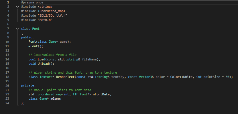 Load 함수는 특정한 파일의 폰트를 로드하고 Unload 함수는 모든 폰트 데이터를 해제한다. RenderText 함수는 문잗열과 문자열 색상, 그리고 폰트 크기를 파라미터로 받아 텍스처를 생성한다. TTF_OpenFont 함수는 .ttf 파일로부터 특정한 크기로 폰트를 로드하며 해당 크기와 일치하는 TTF_Font 폰트 데이터의 포인터를 반환한다. 게임에서 다양한 크기의 텍스트를 지원하려면 TTF_OpenFont를 여러 번 호출해야 할 것이다. Font::Load 함수에서는 먼저 생성하고자 하는 폰트 크기의 벡터를 정의한 뒤 이 벡터를 순회하면서 TTF_OpenFont를 호출한다. TTF_OpenFont는 폰트 크기마다 한 번씩 호출되며, 생성한 각각의 TTF_Font는 mFontData 맵에 추가된다.