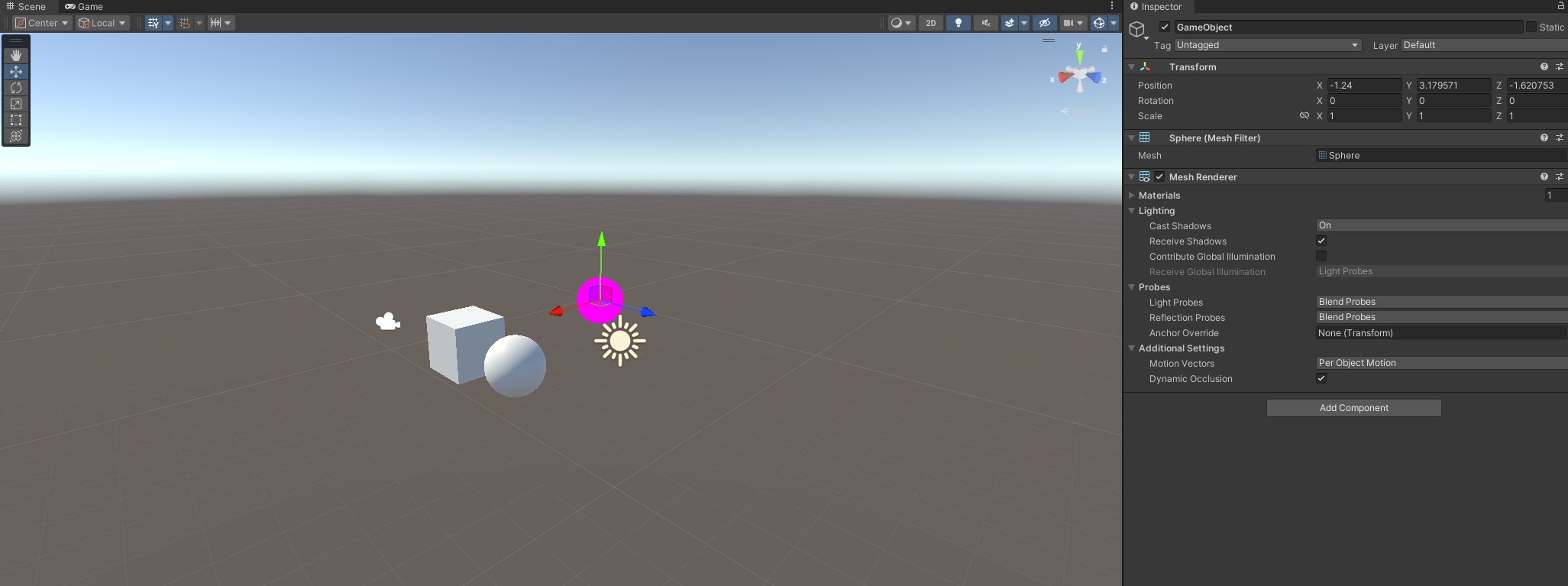 Mesh filter(모양 설정)와 Mesh renderer(렌더 방식 설정)를 통해 Magenta 색의 빈 오브젝트를 구로 만들었다. Magenta 색의 의미는 색상이 지정되어 있지 않다는 것을 알리기 위함이다.