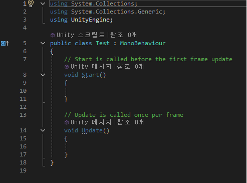 Start 함수는 첫번째 프래임이 시작되기 이전에 호출된다. Update 함수는 매 프래임마다 호출된다. 유니티 엔진이 자동으로 호출해 주는 함수 인데 이것을 유니티 메세지라고 부른다. 스크립트를 적용하려면 오브젝트의 Inspector에서 컴포넌트로 추가해줘야한다.