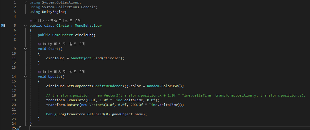 GameObject.Find("Circle")을 통해서 오브젝트를 찾고 circleObj.GetComponent().color를 통해서 컴포넌트에 접근해서 오브젝트의 색깔을 바꿔준다. 여기서 색깔을 바꾸는 함수는 Random 클래스를 이용한다. 그리고 오브젝트의 이동은 transform.Translate함수와 transform.Rotate함수를 사용했는데 각각 x, y, z의 값이 필요하다.