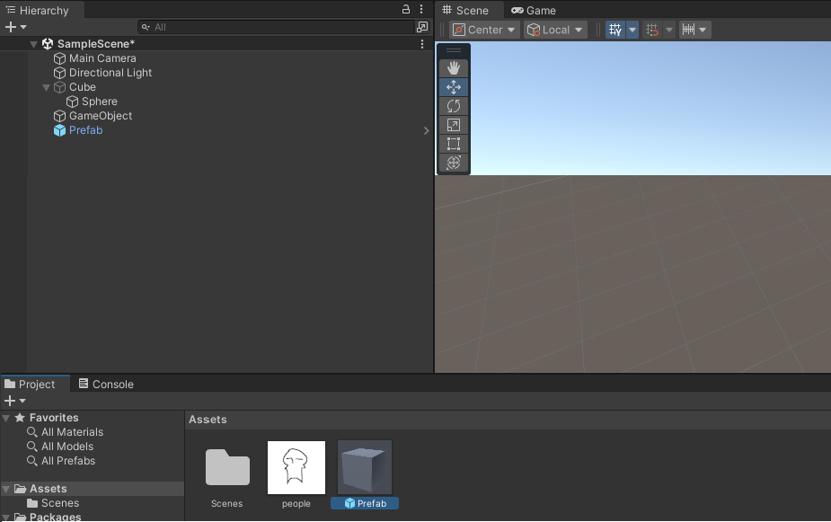 다양한 컴포넌트를 조합해서 오브젝트를 만드는데 완성된 오브젝트를 반복적으로 월드에 놓고싶을때 사용한다. 하나의 프리팹의 컴포넌트가 바뀌면 모든 오브젝트의 컴포넌트가 바뀐다. Hierarchy에서 오브젝트를 Asset으로 끌어당겨서 오브젝트를 프리팹으로 만들 수 있다. 프리팹으로 바뀐 오브젝트는 색상이 파란색으로 바뀐다.