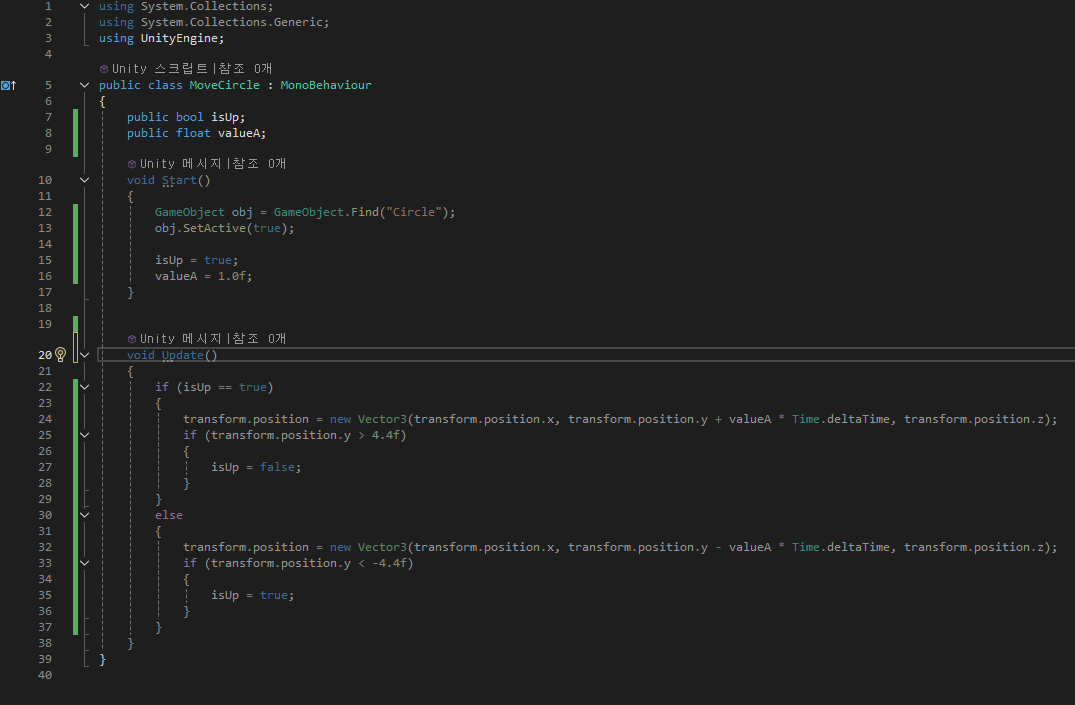 간단한 명령어로 오브젝트를 움직이게 하는 것이다. C# 스크립트를 사용한다. 기본적으로 MonoBehaviour라는 기본클래스의 파생클래스로 생성된다.
