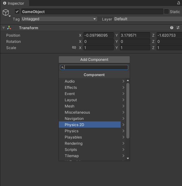 빈 오브젝트를 만들 수 있다(Create Empty). 빈 오브젝트는 컴포넌트들을 담을 수 있는 바구니가 된다. 즉, 오브젝트는 컴포넌트들의 조합으로 이루어진다. 빈 오브젝트의 Inspector 창에서 Add Component를 통해 컴포넌트를 추가할 수 있다.