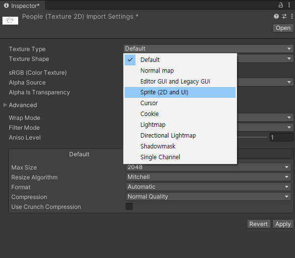 Asset 폴더에 그림을 드래그해서 넣을 수 있다. 그리고 Inspector를 통해 해당 그림의 Texture Type을 설정할 수 있다.
