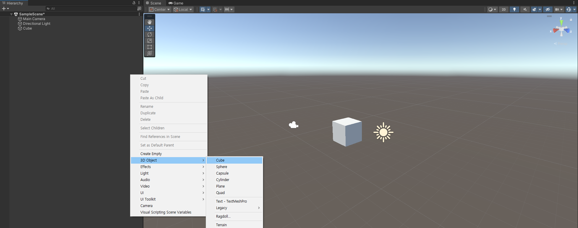 오브젝트에 오브젝트를 자식으로 생성할 수 있다. 큐브 오브젝트의 자식 오브젝트로 구를 생성한 모습이다.