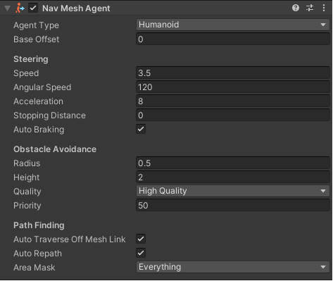NavMeshAgent 컴포넌트를 살펴보면 agent를 통해 다양한 것들을 설정할 수 있음을 알 수 있다.