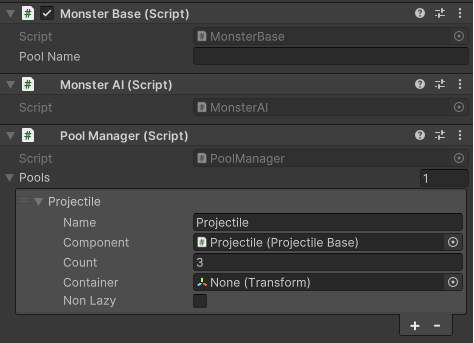 Projectile의 오브젝트 풀은 Enemy가 관리하게 되는데 Enemy에 컴포넌트로 PoolManager를 추가한다. 그리고 Pools에다 오브젝트 풀로 제어할 컴포넌트(Recode Pool에서는 오브젝트가 아닌 컴포넌트로 오브젝트 풀을 제어한다)를 지정하고 개수와 이름을 정한다.
