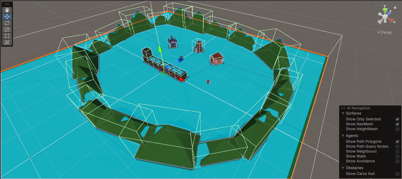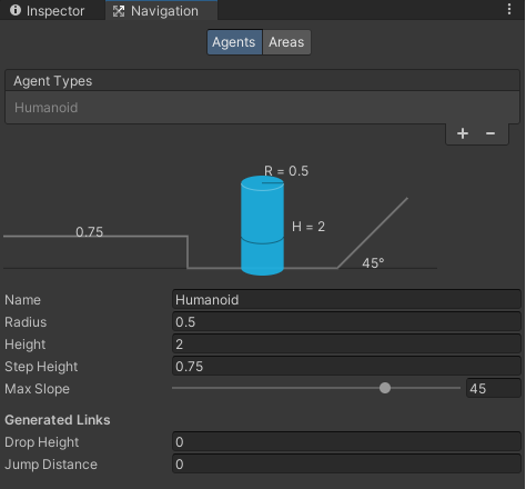 위 사진은 Agent를 설정할 수 있는 탭이다. Agent의 타입은 기본적으로 Humanoid로 되어있으며 따로 추가를 할 수 있다. Humanoid의 설정은 높이가 2, 지름이 0.5인 원기둥으로 Agent의 영역을 설정할 수 있다. 이 영역으로 길찾기와 여러가지 상호작용들을 처리할 수 있다. 왼쪽의 0.75는 걸어올라갈 수 있는 턱의 높이이고 오른쪽의 45는 Agent가 걸어올라갈 수 있는 각도의 정도이다. 이 이상의 높이나 각도는 따로 점프를 한다던지 하는 설정을 해줘야한다. 크기가 다른 몬스터가 있다면 각 몬스터마다 Agent를 설정을 해서 몬스터의 크기가 커서 통과할 수 없는 공간도 통과할 수 있게 되는 불상사를 막아야한다.