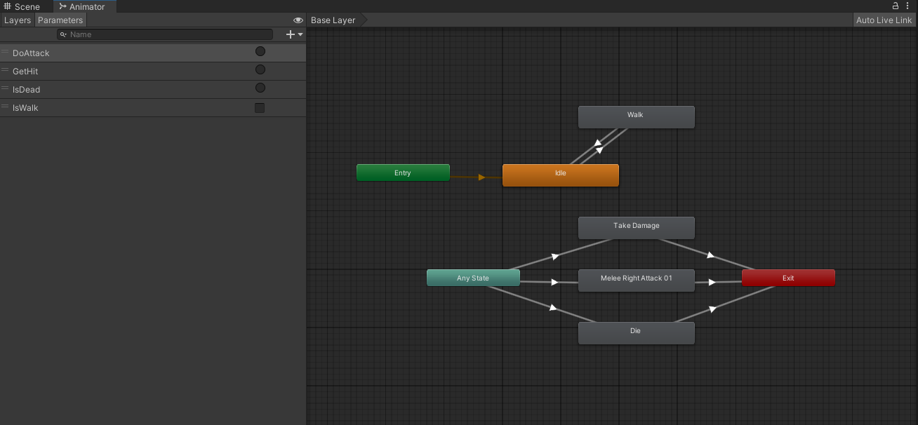 적 몬스터의 구현을 위해 MonsterBase 스크립트와 MonsterAI 스크립트를 생성해서 Enemy 오브젝트에 넣어준다. MonsterBase 스크립트에서는 몬스터의 애니메이션, 몬스터의 상태(체력, 피격관리), 이동 등을 관리하고 MonsterAI 스크립트에서는 유한 상태 기계를 이용해 몬스터의 state에 따라서 행동하는 방식을 결정하게 한다.