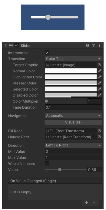 슬라이더의 구성은 배경의 바와 드래그로 값을 조정할 수 있는 핸들, 그리고 핸들이 지나온 곳을 나타내는 Fill Area가 있다. Slider 컴포넌트에서는 버튼처럼 각 이벤트 별로 색깔이나 sprite등을 설정할 수 있고, Fill Area의 모양과 Handle의 모양을 설정할 수 있다. 그리고 Direction에서 어느 방향으로 슬라이더가 진행될지(값이 증가하는 방향)을 설정할 수 있다. 그리고 MinValue와 MaxValue를 정할 수 있다. 여기서는 현재 MinValue가 0이고 MaxValue가 1이다. 그리고 Whole Numbers를 체크하면 슬라이더가 정수값으로만 지정된다. 슬라이더의 이벤트 이름은 On Value Changed로 실수값을 인자로 받는다.
