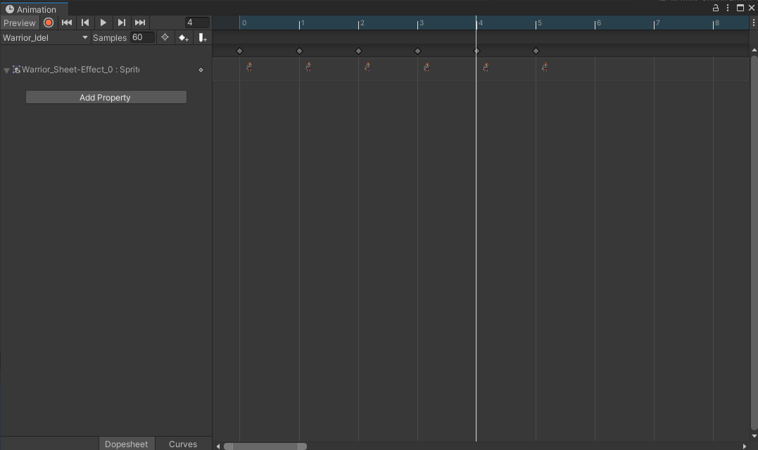 Add Property를 누르고 sprite Renderer->Sprite를 누르면 애니메이션에 대해 초기 Sprite가 생긴다. 그리고 지금은 시간에 따라 스프라이트를 지정할 수 있는데 위에 시간 바 옆에 점 3개를 누르고 Seconds를 Frames로 바꿔주면 프레임마다 스프라이트를 지정할 수 있다. 그리고 Assets에서 프레임마다 스프라이트를 끌어당겨 애니메이션을 만들어준다.