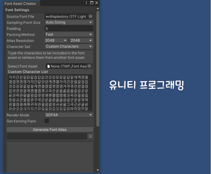 그래서 한글을 쓰고 싶다면 한글을 지원하는 폰트로 이미지화 해줘야한다. Window->TextMeshPro->Font Asset Creator를 선택해서 Font Asset Creator 창을 열어주고 미리 다운받은 폰트를 Source Font File에 넣어준다. 그리고 Character Set을 선택하고 Custom Characters를 선택해주면 아래에 Custom Character List가 나온다. 그리고 게임에 쓸 단어들을 입력해줘도 된다. 하지만 모든 단어들 조합을 넣어줘도 되는데(완성형 한글2350자+자음+모음+영문자+특수기호, https://gist.github.com/taggon/a05af10cb9a38f201aefaacf3391e756) 이렇게 하면 용량이 커지기때문에 추천할 만한 방법은 아니다. 리스트를 작성하고 Generate Font Atlas를 눌러주면 완성이 되는데 이걸 저장해주면 된다. 그리고 모든 단어를 넣다보면 글씨가 깨지게 되는데 이때 Atlas Resolution의 크기를 키워주면 된다.