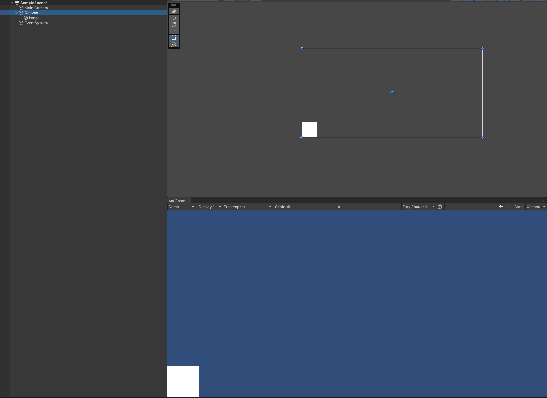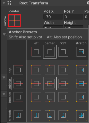 위 그림과 같이 씬에서 현재 보이는 UI 이미지 사각형의 부모 Canvas의 앵커는 가운데에 바람개비 모양으로 보여진다. 그리고 사각형의 피벗은 (0.5, 0.5)로 사각형의 가운데이다. Canvas의 앵커가 원점(0, 0)이자 기준점이므로 사각형의 위치를 (0, 0)으로 하면 Canvas의 가운데에 위치하게 된다. 위 그림에서처럼 위치를 (-70, 0)으로 하면 앵커를 기준으로 x축으로 -70만큼 이동하게된다. 만약의 사각형에서 또 자식 UI를 만들게 되면 사각형의 앵커를 기준으로 자식 UI의 위치를 설정하게 된다.