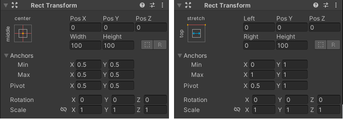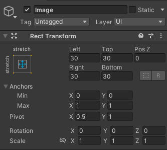 위 사진은 가로 세로 모두 Stretch를 하고 상하좌우로 각각 30만큼 간격을 띄운것이다. Stretch가 아닐때 UI의 크기를 바꿀 떄는 Scale이 아니라 Width와 Height로 크기를 조절해줘야한다. Scale항목은 크기를 가변적으로 변화시킬때, 예를 들어 게임에서 안내창이 커지면서 나타나는 것과 같이 UI의 원래 크기는 바꾸지않고 일시적으로 크기를 바꿀때 사용한다.