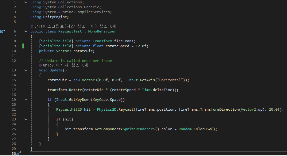 위 코드는 Raycast를 테스트하는 코드인데 먼저 발사 위치를 저장하기 위한 fireTrans를 선언해주고 위 오브젝트 사진에서 대포의 끝에 원의 자식 오브젝트로 빈 오브젝트를 하나 만들어준다. 그리고 스크립트를 원에 컴포넌트에 넣어주고 Inspector에서 스크립트의 Fire Trans에 발사 시작점인 이 빈 오브젝트를 넣어준다. 그리고 rotateDir는 좌우 방향을 기준으로 회전하게 되는데 Input.GetAxis("Horizontal")은 오른쪽 방향키(D키)를 누르면 0에서 1까지 양수의 값으로 증가하게 되고 왼쪽 방향키(A키)를 누르면 0에서 -1까지 음수의 값으로 감소하게 된다. 이걸 이용해서 대포가 z축 방향으로 회전해야하므로 rotateDir의 z 값에 Input.GetAxis("Horizontal")을 넣어준다. 그런데 -Input.GetAxis("Horizontal")인 이유는 오른쪽 방향키를 누르면 시계 방향으로, 왼쪽 방향키를 누르면 반시계 방향으로 회전해야하는데 오른쪽 방향키를 누르면 rotateDir의 z값이 커지는데 z축은 화면의 안쪽으로 들어가는 방향으로 증가하고 z값이 양수이면 반시계 방향으로 돌아가게 되므로 오른쪽 방향키를 눌러도 반시계 방향(원하는 방향과 반대방향)으로 회전하게 된다. 따라서 z값에 -Input.GetAxis("Horizontal")을 넣어 z값이 증가하면 반대로 감소하도록 해줘야한다. 그리고 RaycastHit2D는 많은 정보를 갖고있는데 부딪힌 지점, 부딪힌 오브젝트와의 거리, 법선 벡터등 정보를 갖고있다. 그리고 Physics2D.Raycast(fireTrans.position, fireTrans.TransformDirection(Vector2.up), 20.0f)에서 Raycast함수는 시작점, 방향, ray의 길이를 인자로 받는다. 그리고 마지막으로 hit.transform.GetComponent<SpriteRenderer>().color는 부딪힌 오브젝트의 transform을 hit이 저장하고 있으므로 그걸 이용해서 ray와 닿은 오브젝트의 색을 바꿔준다. 그리고 Raycast는 충돌과 관련된 것이므로 collider 컴포넌트를 대상 오브젝트에 넣어줘야한다.