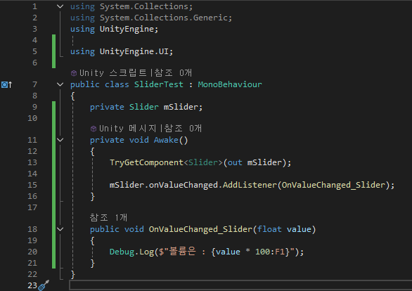 슬라이더를 테스트하는 스크립트인데 토글과 비슷하다. 현재 MinValue가 0이고 MaxValue가 1이므로 0과 1사이의 값을 받아서 처리한다. 그래서 사운드 볼륨이라고 했을때 볼륨은 0부터 100까지라고 설정해서 전달하는 실수값에 100을 곱해줬다. 그리고 :F1을 통해서 소수 첫째자리까지 나타냈다.