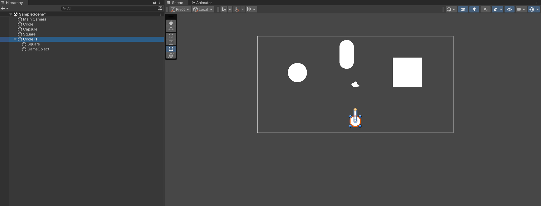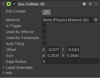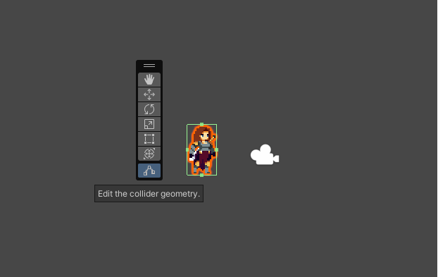 Collider의 크기는 툴 바에서 제일 아래에 위치한 Edit the collider geometry를 이용해 조절이 가능하다. 컴포넌트에서 직접 Size를 바꾸는 것도 가능하다. 위 사진에서 초록색 사각형이 Collider의 크기이다.