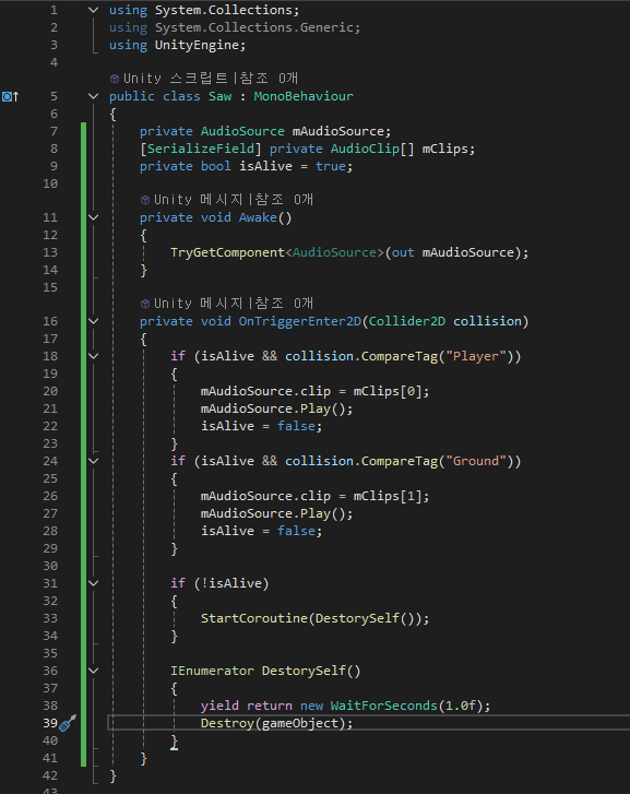 위 소스코드는 Saw에 대한 스크립트인데 먼저 Saw 오브젝트에 AudioSource 컴포넌트를 추가해주고 스크립트에서 AudioClip에 대한 배열을 만들어서 각 상황에 맞는 AudioClip을 선택해서 AudioSource에서 재생하도록 했다. 그리고 캐릭터와 바닥에 Saw가 닿으면 두 가지의 소리가 나는 것을 방지하기 위해서 Saw의 state를 설정해서 플레이어나 바닥에 한 번이라도 닿으면 Saw의 state인 isAlive를 false로 만들어 소리가 한 번만 나도록 설정했다. 그리고 isAlive가 false가 되고 1초 있다가 사라지도록 coroutine을 통해서 설정했다. coroutine에 대해서는 나중에 더 자세히 배울 예정이다. 그래서 지금까지는 배경 설정, 애니메이션 설정, 오브젝트의 collider 설정, 그리고 Saw의 Trigger와 Audio 설정을 마쳤다. 점수에 대해서는 다음에 더 구현하기로 한다.