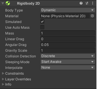 위 사진은 Rigidbody 컴포넌트의 구성 요소들이다. 여기서 Body Type은 Dynamic, Kinematic, Static 세가지가 있다. Dynamic은 중력과 힘의 영향을 받는다. Dynamic body는 모든 바디 타입과 충돌하는 가장 인터랙티브한 바디 타입이다. Kinematic body는 중력과 힘의 영향을 받지 않지만 사용자의 입력에 의해 제어되는 바디 타입이다. Static body는 전혀 움직이지 않도록 디자인되었다. 서로 충돌할 수도 없는 바디 타입이다. 그리고 Mass는 오브젝트의 질량, Gravity Scale은 오브젝트가 받는 중력의 정도이다.