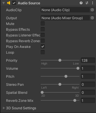 위 사진은 Audio Source 오브젝트에 Audio Source 컴포넌트이다. Audio Clip 항목은 어떤 사운드를 재생할지 설정하는 항목이다. 그리고 Mute는 음소거, Play On Awake는 게임이 시작될 때 사운드를 시작할 것인지를 결정한다. 그리고 Loop는 사운드를 반복해서 재생할 것인지를 결정한다. 그리고 Priority(우선순위), Volumn, Pitch등을 정할 수 있다. Stereo Pan은 사운드가 왼쪽에서 들릴것인지 오른쪽에서 들릴 것인지를 정한다(스테레오 사운드). 오디오를 테스트하기 위해 버튼 자체에다가 Audio Source 컴포넌트를 만들고 버튼을 클릭하면 오디오가 나오도록 테스트해봤다.