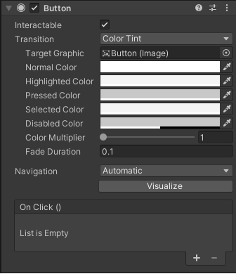 버튼은 단독으로 쓸 수 없다. 버튼은 이미지 컴포넌트와 버튼 컴포넌트로 이루어지며 자식으로 Text(TextMeshPro)를 갖는다. 버튼에 Inspector에서 Image 컴포넌트에 Raycast Target이 있는데 이것은 클릭의 대상이 될지 여부를 판단하는 것이다. Raycast Target이 체크되면 클릭으로 상호작용이 가능하고 체크가 해제되면 클릭으로 상호작용이 불가능하다. 이 기능은 UI가 여러개 겹쳐있을때 상호작용이 될 UI를 선택하는데 도움이 된다.