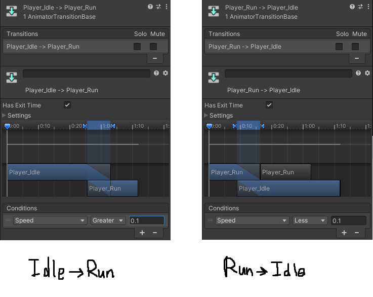 그리고 Transition에 Inspector에서 Has Exit Time은 현재 진행중인 애니메이션이 일정시간이 지날때까지 기다렸다가 다음 애니메이션으로 넘어가도록 하는 옵션이다. 그래서 Codition의 조건이 바뀌어도 일정 시간이 지나야 끝나고 다음 애니메이션으로 바뀌기 때문에 이 게임에서는 이것을 옵션을 꺼주었다. 그리고 Settings를 열면 Transition Duration이라는 항목이있는데 두 개의 애니메이션을 일정 시간동안 섞어서 움직임이 자연스럽게 변하도록 설정하는 것인데 2D 스프라이트에서는 제대로 적용이 되지 않으므로 0으로 설정해준다. 그리고 이제 키보드로 캐릭터의 움직이는 스크립트를 만들어준다. 이 스크립트에서는 캐릭터의 애니메이션의 변경 조건도 설정해준다.