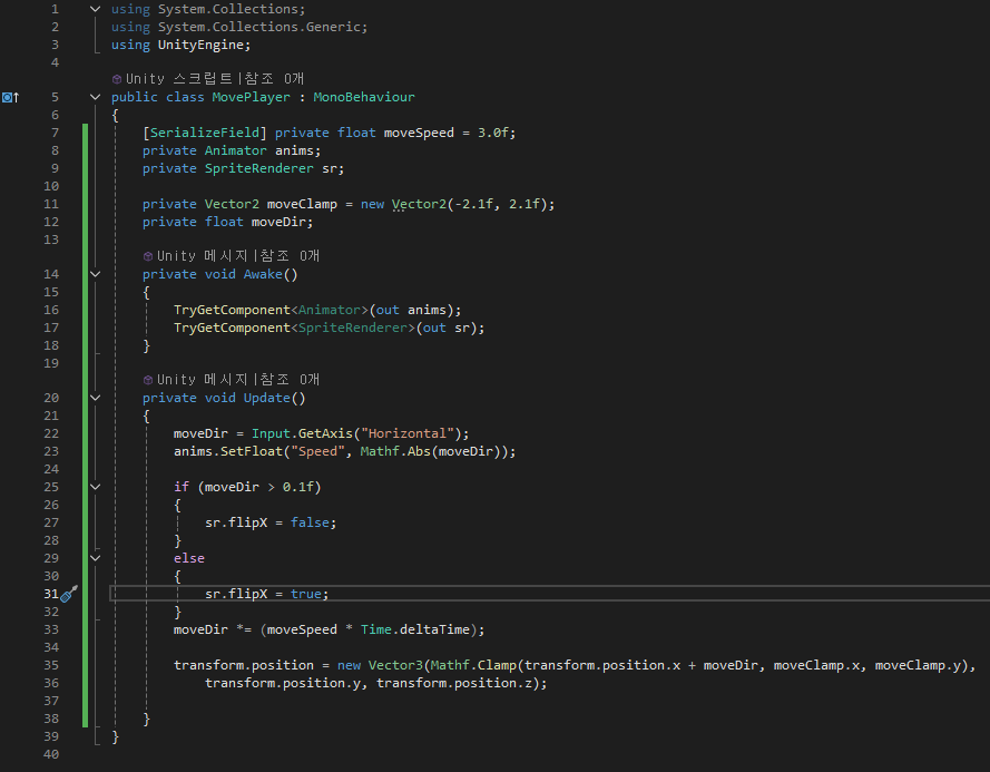 위 사진이 플레이어의 움직임에 대한 스크립트이다. Animator 컴포넌트에 접근해서 SetFloat함수를 통해 Transition의 Condition인 Speed에 접근해서 키보드로 입력받은 moveDir의 값에 따라 Speed를 변화시켜 애니메이션을 바꾼다. 그리고 플레이어 캐릭터가 오른쪽으로 갈때는 오른쪽을 보고 왼쪽으로 갈때는 왼쪽을 보도록 flipX를 이용한다. flipX는 스프라이트의 좌우반전 flipY는 상하반전이다. 여기서 캐릭터 플레이어는 기본적으로 오른쪽을 보고있기 때문에 moveDir가 양수일때 즉 0.1보다 클때는 반전을 시키지 않고 moveDir가 음수일때 왼쪽으로 이동하는 것이되므로 flipX를 true로 바꿔서 좌우 반전을 시킨다. 그리고 moveDir와 transform.position을 이용해서 캐릭터를 이동시킨다.