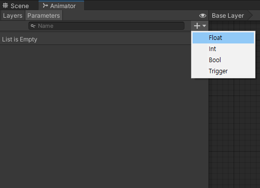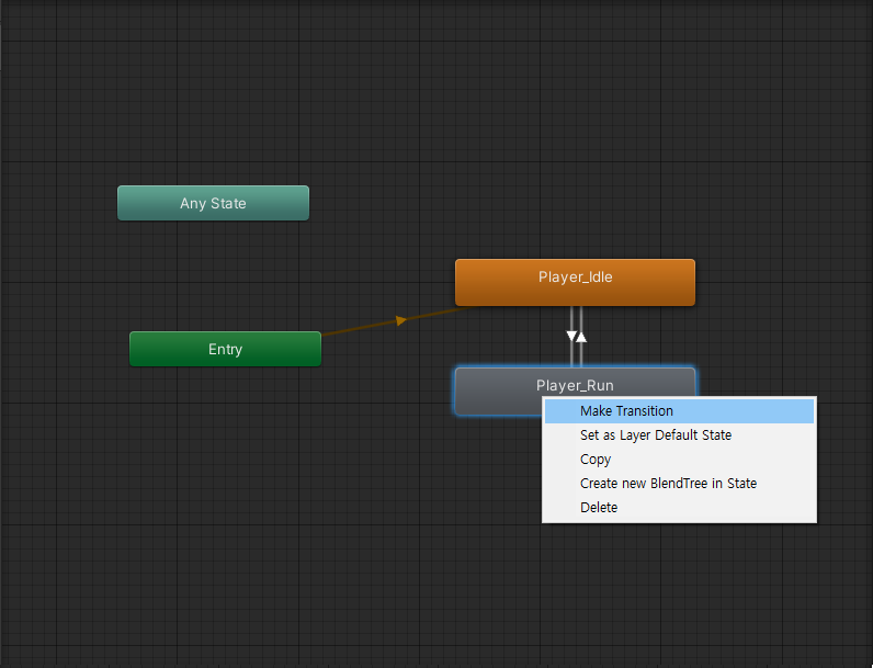 Entry가 기본 상태이고 지금은 Transition을 통해 Player_Idle 애니메이션에 연결되어있다. 플레이어가 달릴 때 Player_Idle에서 Player_Run으로, 달리다가 멈췄을 때 Player_Run에서 Player_Idle로 애니메이션을 바꿔줘야하므로 Transition을 서로에게 연결시켜준다. 애니메이션을 변경하기 위한 파라미터를 Animator 창의 Parameters에서 설정할 수 있다.