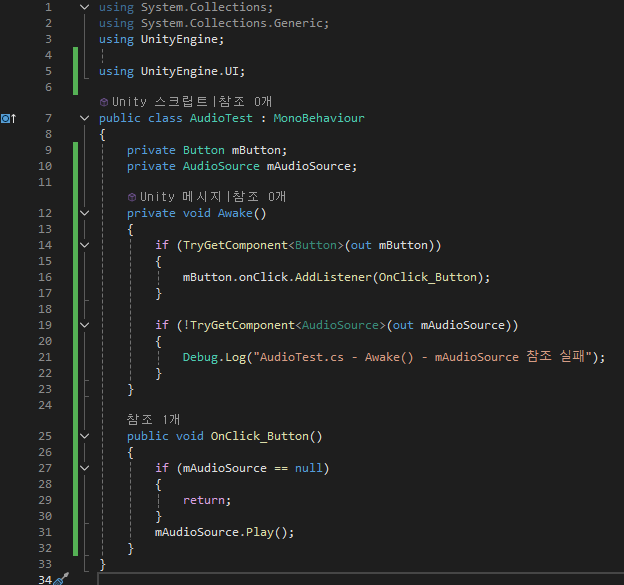 버튼 테스트 스크립트와 비슷하다. TryGetComponent<AudioSound>가 없을 때 오류 메세지를 발생시키고 버튼이 클릭됐을때 AudioSource의 Play()함수를 통해 소리를 출력한다.