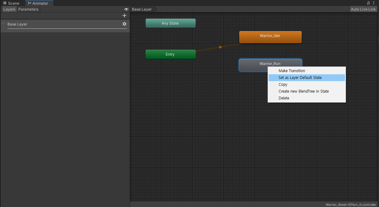 여기서 Warrior_Run을 우클릭하고 Set as Layer Default State로 설정하면 기본 애니메이션이 Warrior_Run으로 바뀐다.