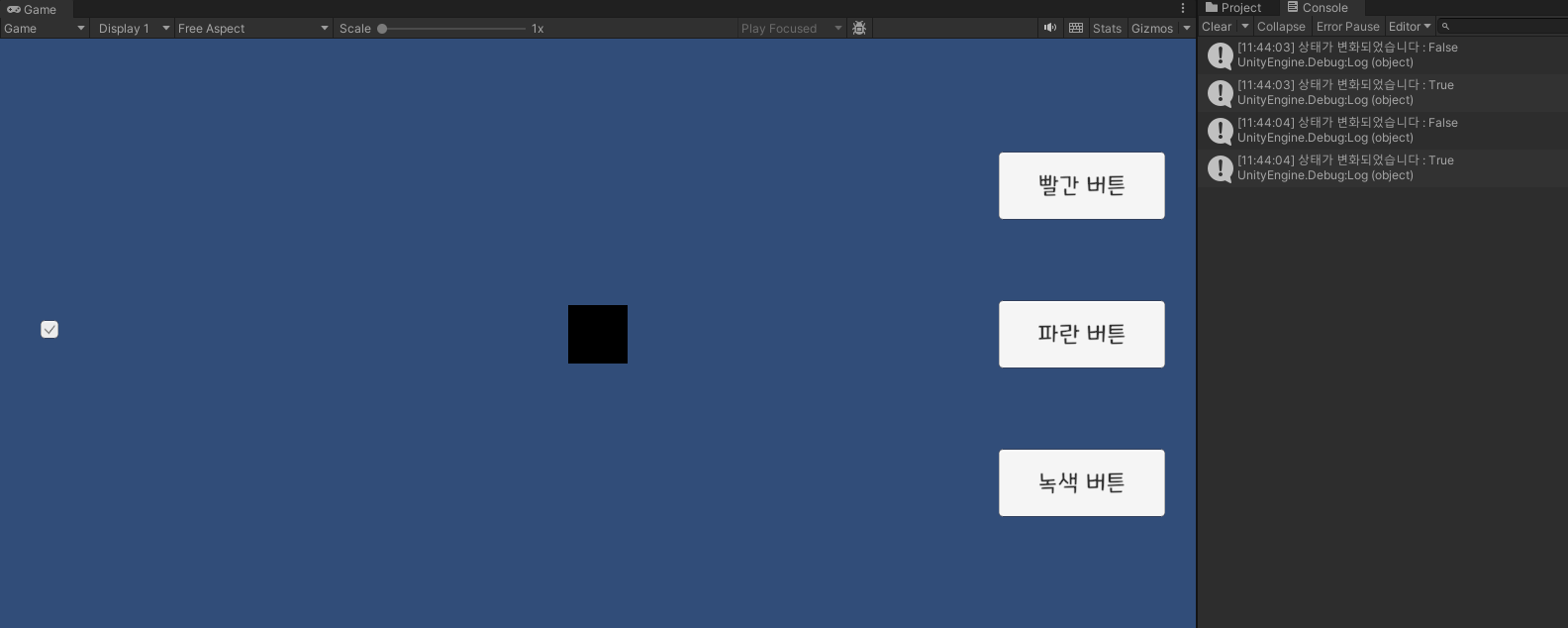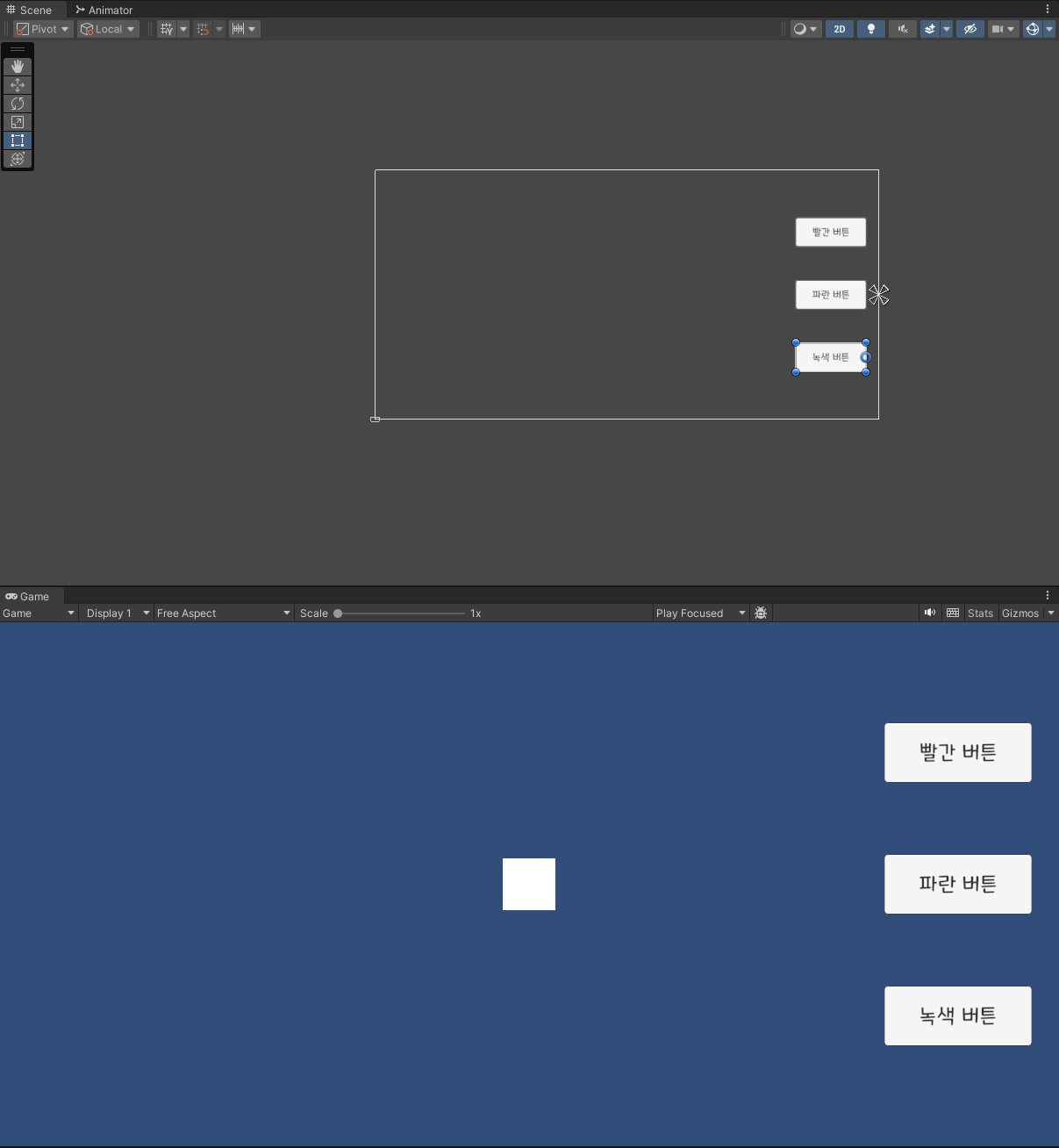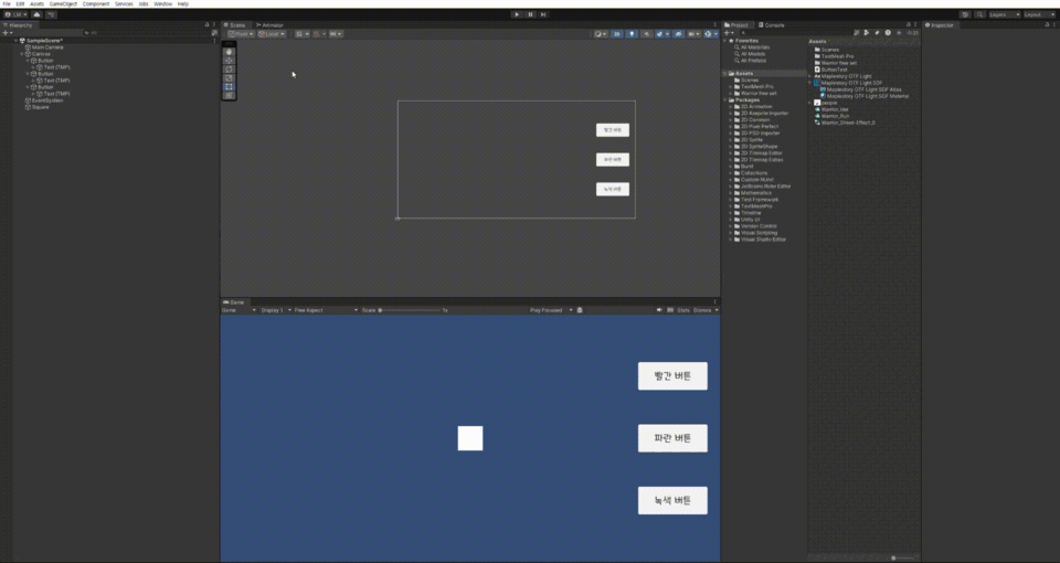 버튼을 테스트하기 위해 가운데에 사각형 오브젝트를 하나 만들어주고 누르면 사각형 오브젝트의 색깔이 바뀌는 버튼 세개를 만들어준다.