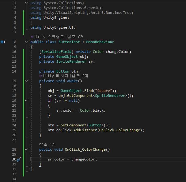 위 소스코드는 버튼 테스트에 대한 스크립트이다. 먼저 스크립트에서 UI에 대해 접근하려면 using UnityEngine.UI 네임스페이스를 선언해줘야한다. 그리고 Inspector에서 색깔에 접근할 수 있도록 Color 구조체를 멤버변수로 선언한다. 그리고 Button에 대해 접근할 수 있는 멤버변수 btn도 선언해준다. 그래서 Awake함수 내에서 GetComponent<Button>()으로 버튼 컴포넌트에 접근한다. 그리고 버튼이 클릭됐을때 호출할 함수를 인자로 받는 OnClick.AddListener함수를 선언해서 버튼이 클릭됐을때 이벤트에 대한 행동을 다룬다. AddListener함수는 지정된 함수를 호출하는 함수이다. 버튼이 클릭됐을때 OnClick_ColorChange()함수를 선언해서 지정한 색깔로 바뀌게 설정한다. 그리고 해당 스크립트를 각 버튼에 넣어준다.