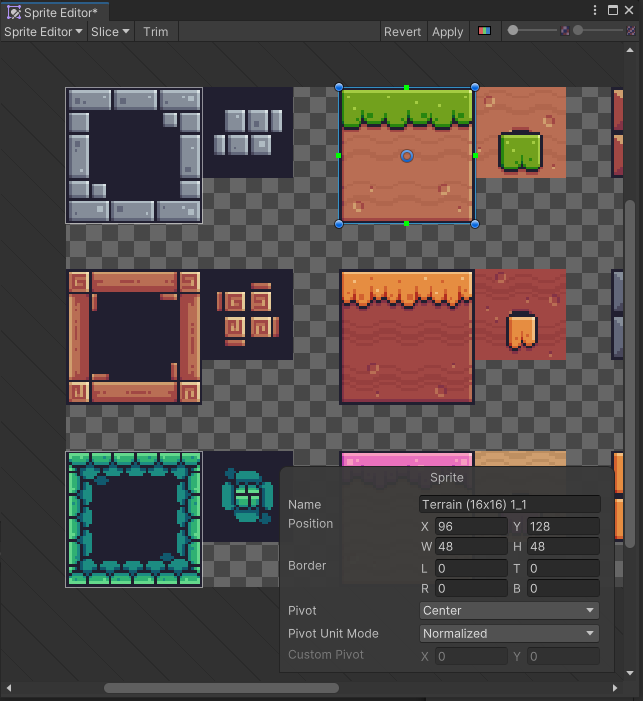 그리고 이번엔 전체 이미지 PNG에서 이미지를 잘라서 타일로 써보겠다. 먼저 스프라이트의 Inspector에서 Sprite의 모드를 Multiple로 바꿔준다. 그럼 이제 Sprite Editor에서 스프라이트를 나눌 수 있다. 스프라이트에서 사용할 부분을 사각형으로 선택해주고 Apply를 누른다.