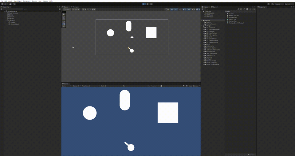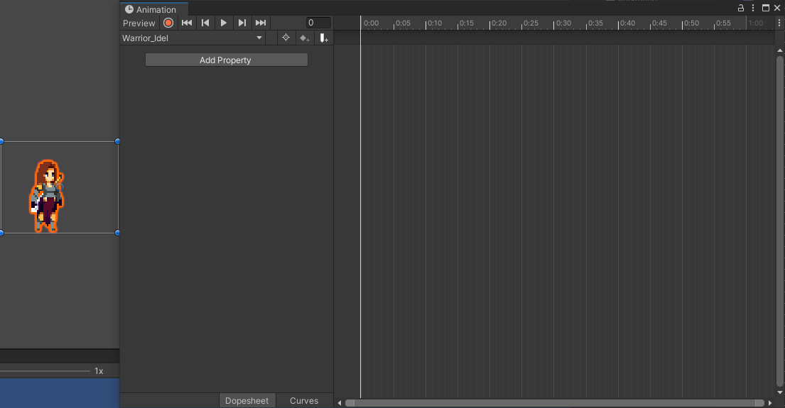 프레임 바이 프레임을 구현하기 위해서 에셋 스토어에서 "warrior free" 라는 도트 그래픽 애니메이션을 Import해서 프로젝트에 Assets에 저장했다. 유니티 에셋 스토어에서 저장한 에셋은 상단 메뉴 바에서 window->package manager에서 확인할 수 있다. package manager에서는 유니티 프로젝트에서 사용할 수 있는 기능들을 볼 수 있다. 여기서 My Assets에 들어가면 다운받은 에셋들을 확인할 수 있다. Warrior의 기본 이미지로 오브젝트를 만들고 Animation(단축키 ctrl+6) 창을 띄운다.