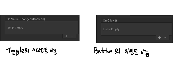그리고 AddListener에서 처리하는 함수의 인자값도 다르다. 위 코드에서 토글의 이벤트 처리 함수 OnValueChanged_Toggle에서 인자로 bool값을 받아와 bool값을 처리한다. 토글 컴포넌트에서 인자도 확인할 수 있는데 OnValueChanged(Boolean)라고 되어있어 어떤 값을 받아와 처리하는지 알 수 있다. 그에 반에 버튼은 OnClick()이므로 void로 되어있어 아무것도 받아오지 않는다. 토글은 텍스트도 갖고있지만 TextMeshPro가 아니다.