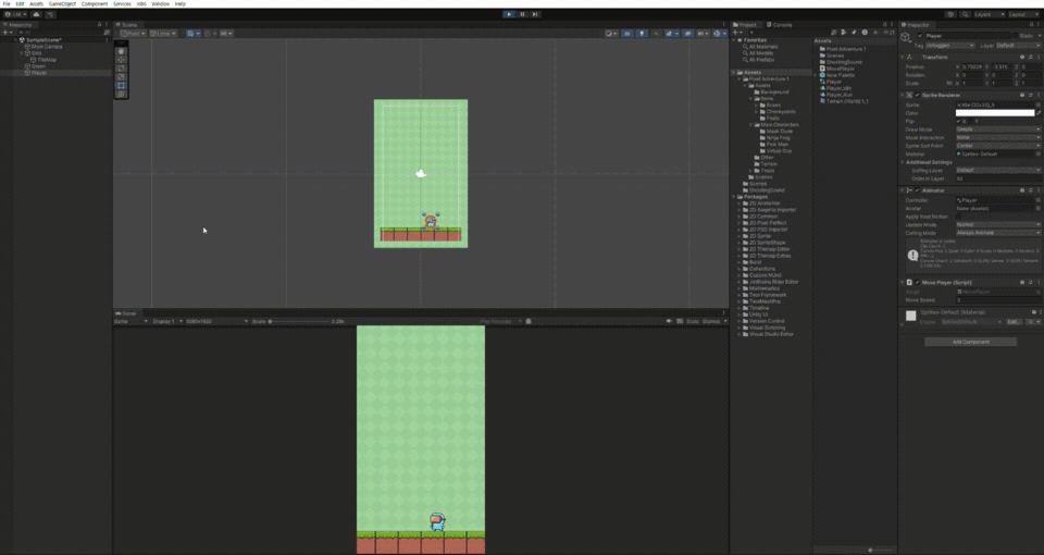여기서 스프라이트들이 그려지는 순서가 중요하다. 각 오브젝트마다 Order in Layer(그려지는 순서)가 있는데 그 숫자가 낮을수록 먼저 그려진다. 나중에 그려지는 스프라이트가 먼저 그려지는 스프라이트를 가린다. 그래서 스프라이트가 뒤에 있을수록 Order in Layer의 숫자가 낮아야한다. 그래서 뒤에 초록 배경의 Order in Layer를 20, 앞에 TileMap의 Order in Layer를 50으로 설정해주었다. 그리고 Player를 스프라이트를 골라서 넣어준다. 그리고 이제 플레이어의 애니메이션을 설정해준다. 지금 게임에서는 가만히 있을때(Idle)와 달릴때(Run) 두 가지 애니메이션을 만들어준다. 그리고 애니메이션의 설정을 살펴보자.