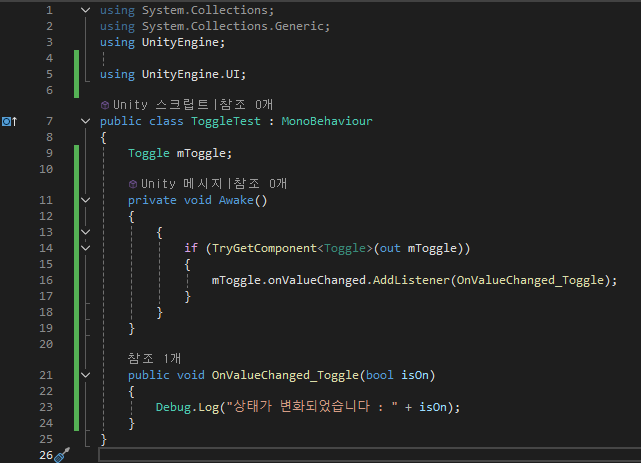 위 실행 화면과 소스코드는 토글을 테스트하는 것으로 토글 버튼을 누르면 값이 True로 해제되면 값이 False로 유지되는 것을 볼 수 있다. 소스코드에서 버튼과 다른 것을 볼 수 있는데 TryGetComponent함수의 사용이다. GetComponent는 해당 오브젝트에 찾고자하는 컴포넌트가 없으면 유니티엔진에서 에러가 뜬다. 게임을 실행해도 오류로 인해 실행이 안된다. 그러나 TryGetComponent함수를 사용하면 오류가 뜨지않고 그냥 넘어간다. TryGetComponent함수는 bool값을 반환한다. 그리고 TryGetComponent의 인자는 대상이 될 컴포넌트가 들어간다. 즉, TryGetComponent에서 컴포넌트를 찾아 인자에 저장한다. 그리고 토글에서는 이벤트의 이름이 onValueChanged로 이름이 다른데 이벤트의 이름은 각각 컴포넌트에서 확인할 수 있다. 버튼의 이벤트의 이름은 onClick이다.