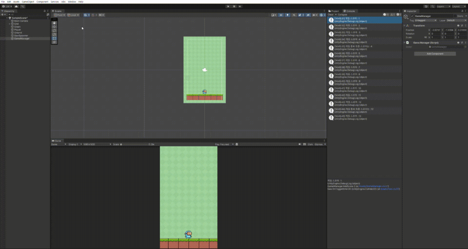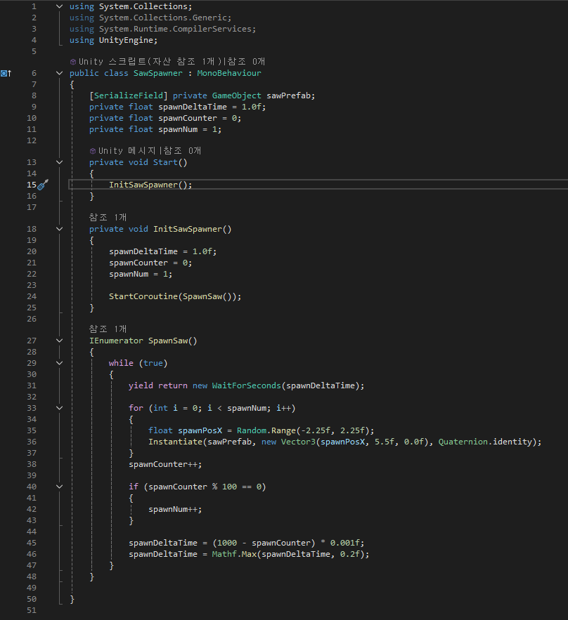 먼저 이전에 이미지 오브젝트를 생성했던 것처럼 sawPrefab이라는 프리팹을 저장할 수 있는 GameObject를 선언해준다. SpawnDeltaTime은 saw 프리팹을 생성하는 주기를 설정하는 변수로 처음은 1.0f로 초기화해준다. spawnCounter는 saw가 얼마나 생성되었는지를 설정하는 변수이다. 그리고 spawnNum은 한 번에 생성될 saw의 갯수를 설정한다. spawnCounter에 의해 spawnNum과 spawnDeltaTime이 변경된다. spawnCounter가 100으로 나눠떨어질때마다 spawnNum이 하나씩 증가하고 spawnCounter가 증가할 때마다 spawnDeltaTime은 감소해서 최대 0.2f까지 감소한다. 여기서 중요한 것은 Coroutine함수인데 IEnumerator 반환 타입을 갖는 함수 SpawnSaw를 선언하고 while문으로 함수 안의 내용을 반복하지만 yield return 반환문으로 WaitForSeconds함수를 통한 시간동안 쓰레드를 양보하게된다. 이것이 코루틴 함수인데 아래에 더 자세하게 다룬다. 그리고 코루틴 함수는 StartCoroutine을 통해 사용해야한다. 이것을 프로젝트에 적용하면 saw 프리팹이 게임내에서 스폰되는 것을 볼 수 있다. 그리고 게임의 전체적인 컨트롤을 위해서 GameManager라는 오브젝트와 스크립트를 만들어준다.