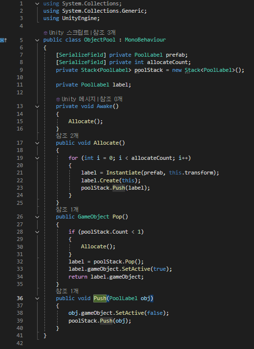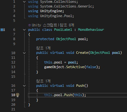 위 스크립트는 PoolLabel의 스크립트이다. 먼저 멤버 변수로 Projectile이 들어갈 pool을 나타내는 ObjectPool을 선언해준다. 그리고 Create 함수에서 ObjectPool을 이용해 자신이 저장될 pool을 정해주고 생성된 Projectile을 일단 비활성화 해준다. 그리고 Push 함수는 자기 자신을 자신의 pool에 저장하는 pool.Push 함수를 호출하도록 한다.