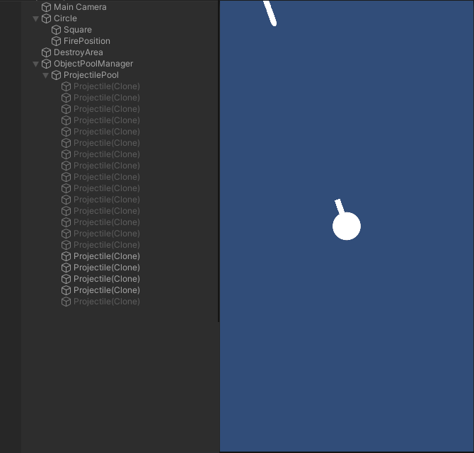 위 실행 화면을 보면 일정 개수만큼 미리 생성한 오브젝트들이 있고 비활성화되어있다가 발사를 하면 활성화되어서 생성된 뒤 이동한다. 그리고 화면 밖으로 나가서 일정 범위밖으로 나가면 다시 비활성화되고 스택에 들어가게 된다.