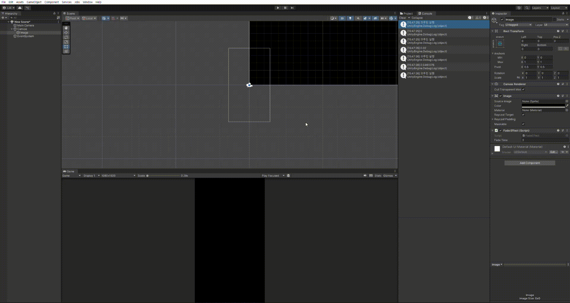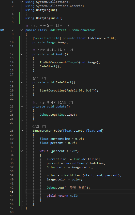 FadeEffect 스크립트에서는 화면의 검은 이미지 UI가 코루틴 함수에서 이미지의 알파값(투명도)을 선형 보간 함수 Lerp으로 점점 줄여서 알파값이 0이 돼서 화면이 밝아지도록 했다. Awake에서 FadeStart 함수를 통해서 Fade 코루틴을 호출하고 Update에서는 현재의 시간을 콘솔 창에 띄우도록 했다. 그리고 Fade 함수 내에서는 currentTime과 fadeTime을 이용해 2초동안 fade in되도록 설정했다. 그리고 마지막에 yield return null로 다음 프레임까지 스레드를 양보하도록 설정해서 Fade 코루틴은 while문으로 계속해서 스레드를 잡고 이미지의 알파값을 낮춰야하지만 yield return을 통해서 스레드를 시간을 출력하고 있는 Update에 양보하는 것이다.
